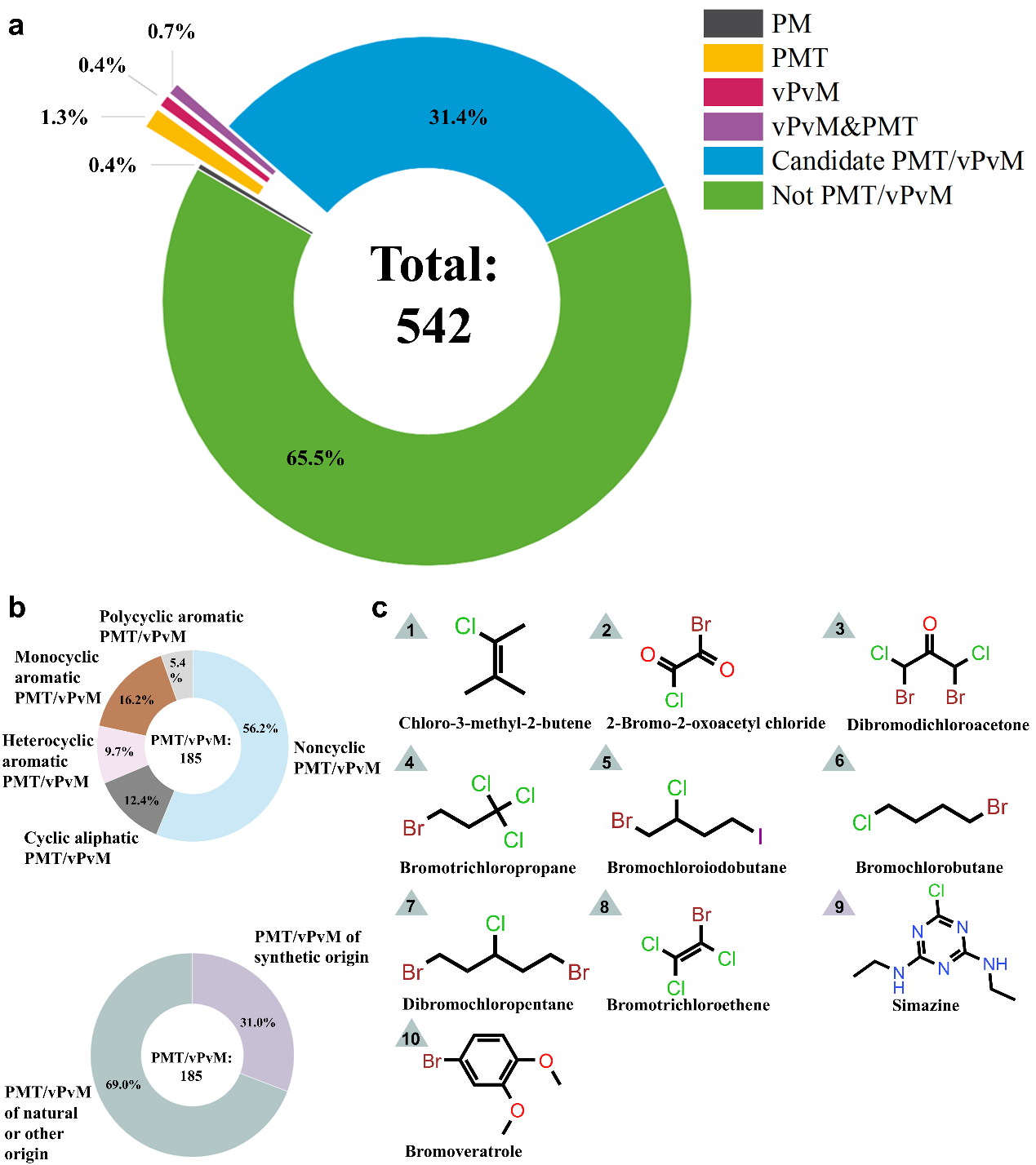 目前,PMT/vPvM物质的识别高度依赖于高质量的实验数据。然而,许多化学物质仍缺乏可靠的实验数据,这阻碍了PMT/vPvM物质的快速识别与筛查。中国科学院广州地球化学研究所博士生韩民在导师金彪研究员的指导下针对冻土活动层中污染物PMT属性不清,来源不明等问题,整合近期相关文献数据构建了含542种化合物的筛查清单,采用标准数据评判与机器学习融合的方法(图1),识别出185种PMT/vPvM物质(占比约34.1%),其中69%的物质为天然来源或未知来源(图2)。