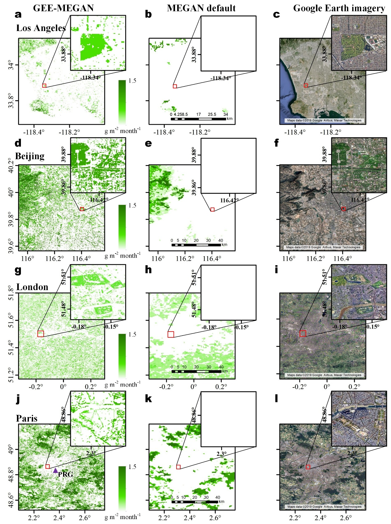 图2 GEE-MEGAN和传统MEGAN2.1模型在巴黎、洛杉矶、伦敦和北京针对异戊二烯排放模拟与Google地图影像植被空间分布的对比