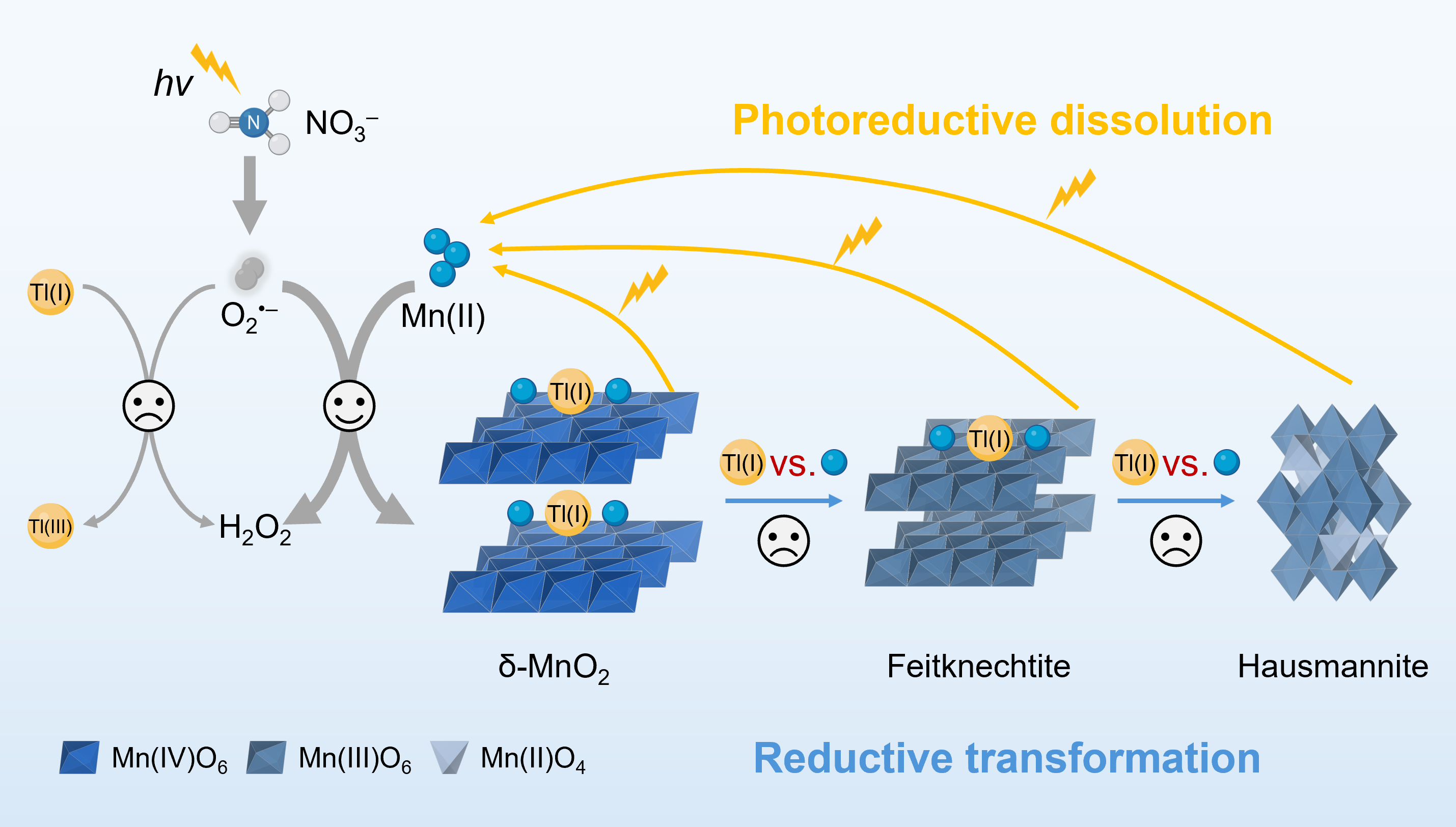 纳米矿物(含矿物纳米颗粒)广泛分布于地球表层环境中,具有种类多、丰度高、活性强等特点,其成因机制、微观结构、反应活性、地质/地化功能属性及生态环境效应,受到矿物学及相关学科的共同关注。锰(氢)氧化物(MnOx)是一种普遍存在于地表环境中的纳米矿物,制约着元素氧化还原循环、环境物质迁移转化等重要地质地化过程。MnOx与铊(Tl)具有很强的亲和力,其形成和转化在Tl的地球化学循环中起着至关重要的作用。近期研究表明,光照是驱动锰(Mn)氧化还原循环的关键非生物因素,然而光照条件下Mn和Tl的耦合循环机制尚不明晰。