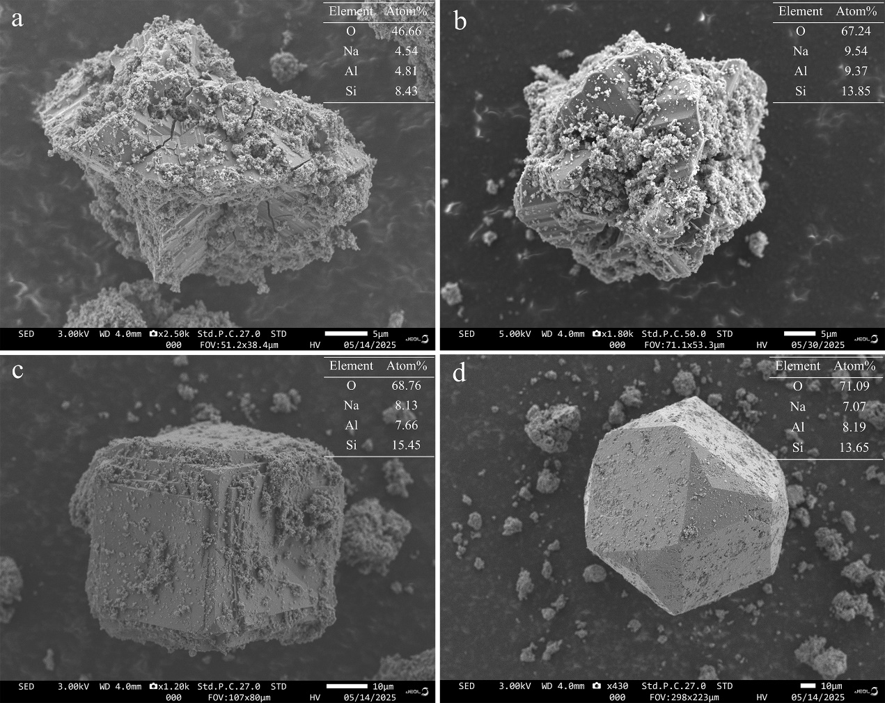 图2. 几种沸石的扫描电镜图(a.戈沸石;b.十字沸石;c和d.方沸石)