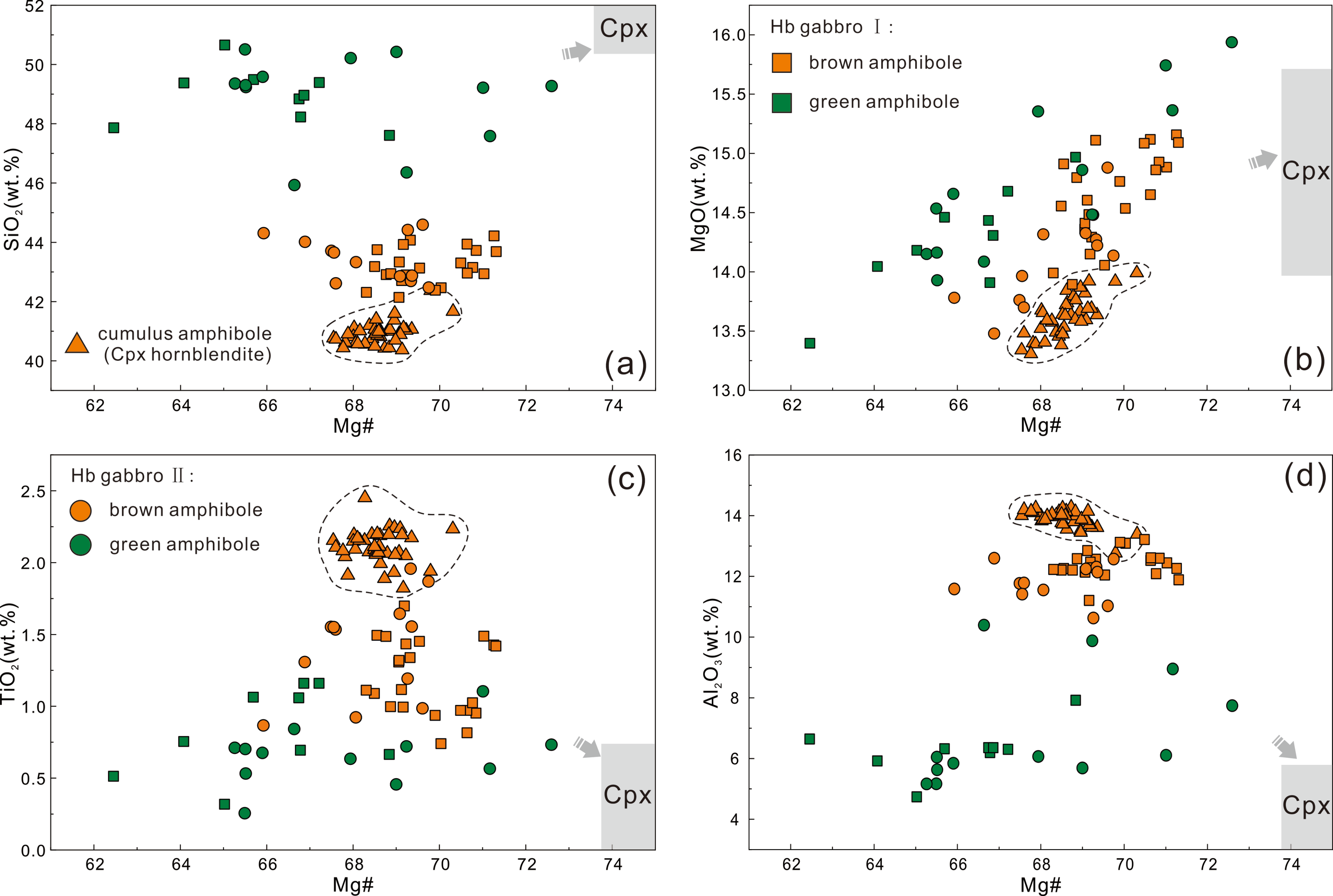 1. 阐明富角闪石堆晶岩主要由结构和化学成分截然不同的辉石角闪石岩和两类角闪辉长岩(Group Ⅰ 和Group Ⅱ)组成,单矿物压力计结果结合三类岩石复杂的野外接触关系表明它们形成于同一个中-下地壳岩浆储库;