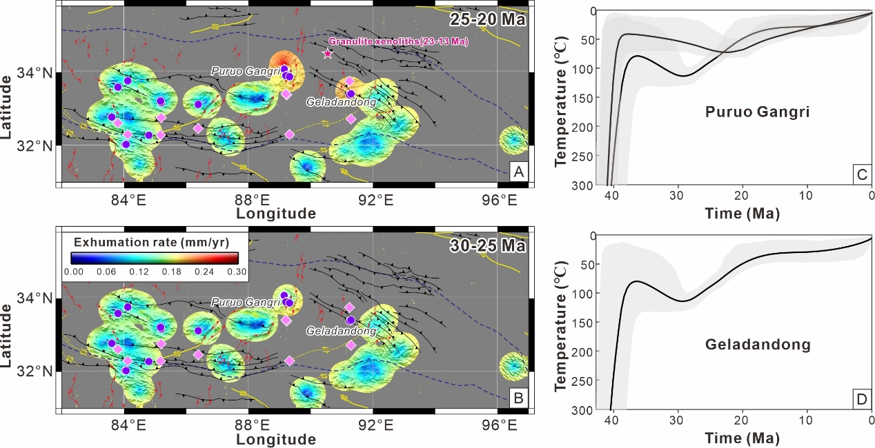 为了解决上述问题,中国科学院广州地球化学研究所龚林博士、王强研究员与青岛崂山实验室李正祥教授及合作者以羌塘高原的始新世花岗岩为研究对象进行系统的矿物学、低温热年代学和热史模拟,并结合区域已发表的低温热年代学数据,以剥露速率时空变化的视角重建了羌塘高原的生长过程及其机制,并取得了如下进展: