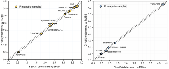 激光诱导击穿光谱 (LIBS) 是一种应用广泛的光谱分析技术,其原理是通过接收激光与样本表面相互作用产生的等离子体发射光谱,实现对样品中元素的定性和定量检测。LIBS具有对全元素分析的潜力,相较于电子探针分析 (EPMA) 和二次离子质谱 (SIMS) 等传统分析手段,具有无需样品前处理,操作便捷、分析高效、成本低廉等优势。近期,杨武斌研究员团队通过构建高精度LIBS分析方法,成功实现了磷灰石中的F和Cl含量的定量检测。