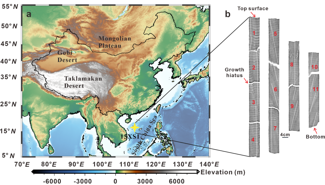 亚洲沙尘活动深刻影响区域气候、空气质量和海洋生物地球化学过程,但其长期演变究竟主要受自然气候变化驱动,还是更多反映现代人类活动影响,仍存在争议。现有认识主要来自黄土、湖泊沉积物和冰芯等陆地记录,连续、高分辨率的海洋证据相对缺乏。大型块状滨珊瑚骨骼Ba/Ca能够记录海水中溶解态Ba的变化,为追踪远距离沙尘输送提供了新的海洋代用指标。基于此,中国科学院广州地球化学研究所博士后邓广超和合作导师邓文峰研究员等以西沙群岛块状滨珊瑚为研究对象(图1),重建了1816-2014年期间亚洲沙尘向南海北部远距离输送的变化特征,并取得以下主要认识: