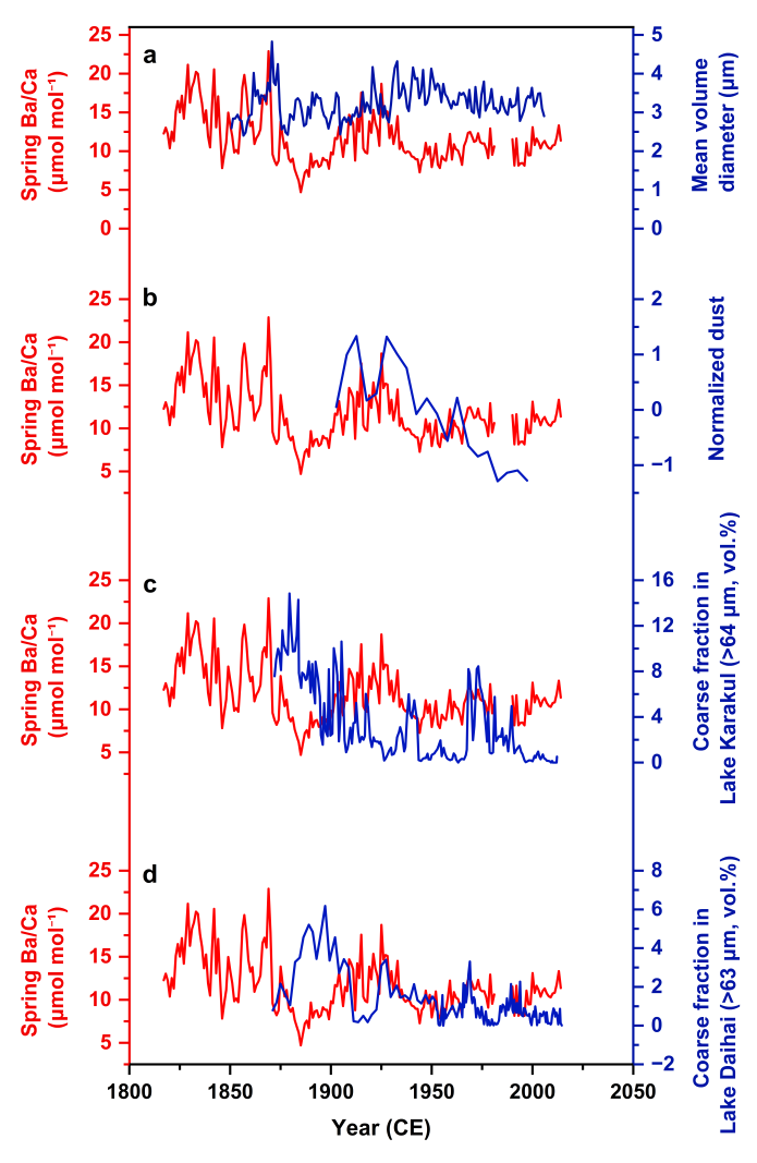 图4 珊瑚骨骼Ba/Ca记录与陆地沙尘代用指标的对比