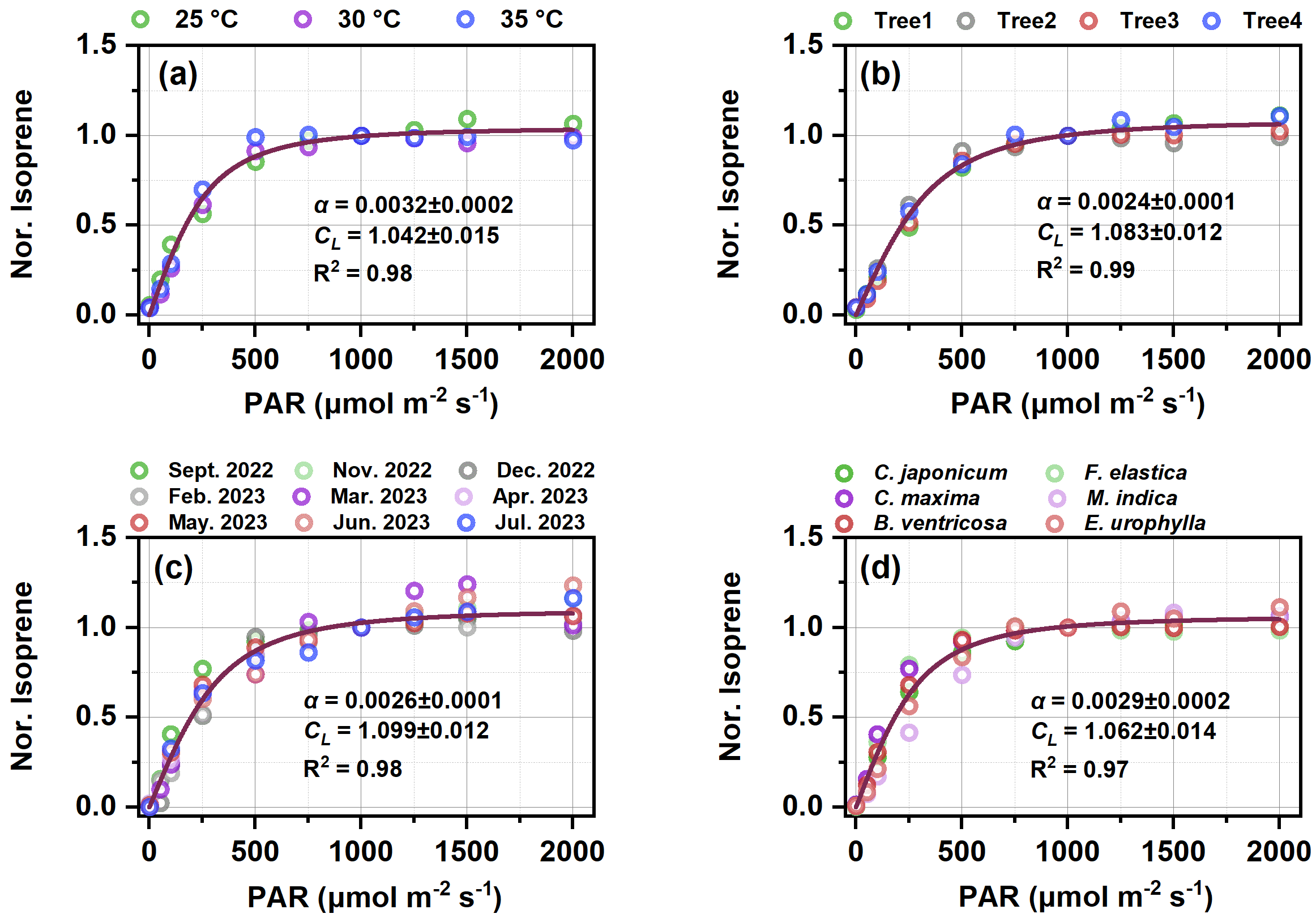 图1. 不同温度(a)、不同个体(b)、不同月份(c)、不同树种(d)的光响应关系