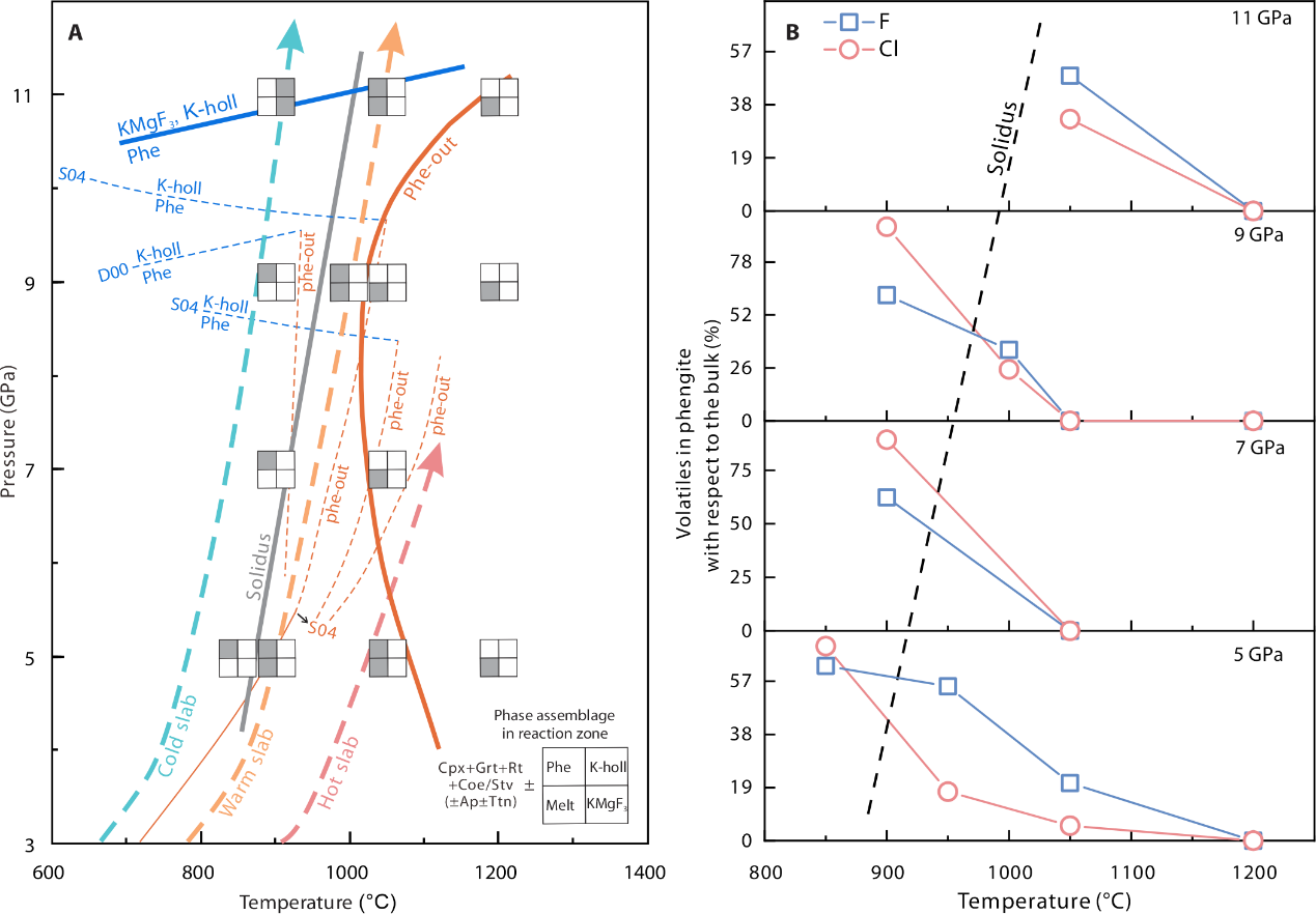 图1. 含 F、Cl 多硅白云母的高压稳定性及其对深俯冲卤素循环的贡献