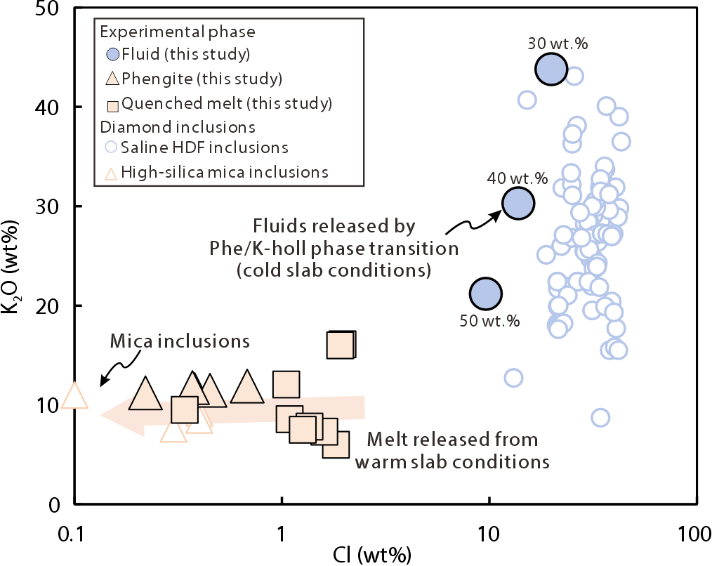 实验结果表明,多硅白云母在高达11 GPa(约330公里深度)和1050℃的深俯冲环境中仍可保持稳定(图1)。这一发现说明,多硅白云母能够携带地表来源的挥发分有效突破浅部挥发分释放限制,是将F、Cl输送进入深部上地幔的重要载体。进一步研究显示,当多硅白云母在深部失稳分解时,F与Cl的地球化学行为发生显著解耦一方面,Cl表现出极强的不相容性,主要进入释放出的流体相中。实验获得的富Cl流体(9.6-19.9 wt.% Cl)与天然克拉通深部金刚石中的高密度盐水包裹体(HDFs)在成分上高度吻合(图2)。这一结果从实验角度表明,这类深部金刚石中流体包裹体的成分很可能与俯冲洋壳物质的深部再循环密切相关。另一方面,与Cl不同,F会被新生成的高压残余相——氟镁钾矿(KMgF3)有效截留,从而脱离流体相约束,以固相形式继续向更深地幔运输。