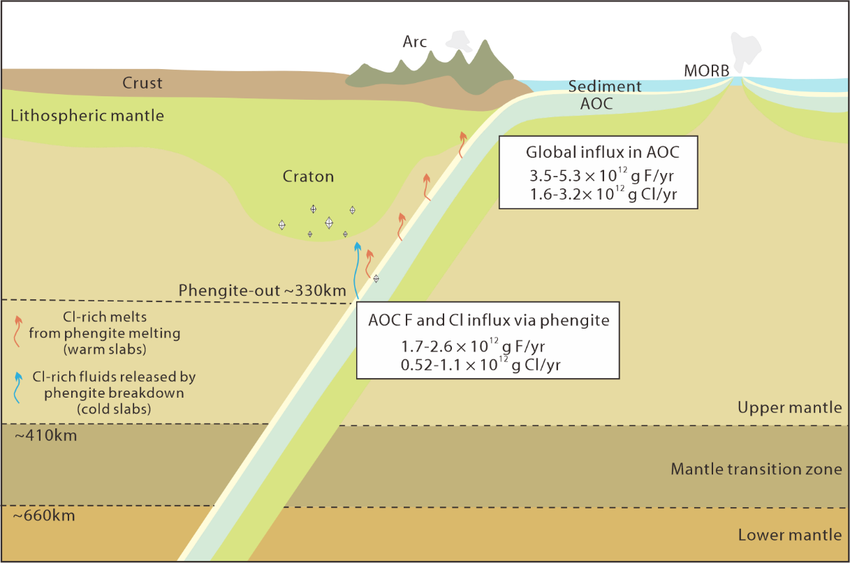 俯冲带是驱动地表与地球深部挥发分循环的核心枢纽。卤素(如F、Cl)作为探究深部流体演化与壳幔相互作用的灵敏探针,其自身的深部迁移规律及机制长期悬而未决。根据传统地球化学模型,Cl极易进入流体相而发生活跃迁移,F虽易赋存于矿物晶格,却也会随浅部含水矿物的脱水分解而大量流失。这就意味着,在俯冲板片抵达弧岩浆发源深度(通常小于150公里)之前,板片携带的F与Cl(尤其是后者)即已在脱挥发分作用下消耗殆尽。由此推论,深部地幔本应相对贫F和Cl。然而,天然样品却提供了相悖的记录:全球多地的深部金刚石包裹体中频繁发现高盐度流体成分,而深部地幔矿物中也探测到异常的氟富集现象。这些本应在浅部流失的挥发分,究竟是如何突破浅部脱挥发分屏障,并成功运移至数百公里深的地幔之中?