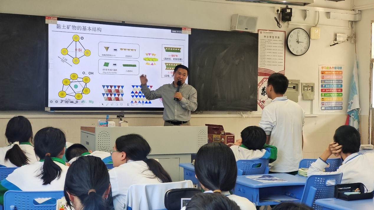 陶奇研究员从“杞人忧天”的成语故事切入,提出“那位忧天的杞人,真的只是一个笑话吗?”等引人深思的提问,引发同学们极大的新奇。从担心“天塌地陷”的朴素疑问,到现代研究小行星防御、地震预警和板块构造的科学实践,人类探索未知、求解本质的精神一脉相承。随后,他巧妙地将话题引向了自己的科研领域。他将地球和火星上的黏土矿物比喻为记录星球演化奥秘的“时间胶囊”和“自然密码本”。讲座通过一幅幅精美的矿物微观电镜图片和生动的晶体结构动画,向同学们展示了蒙脱石、高岭石等常见黏土是如何从最基本的硅氧四面体、金属八面体“积木”搭建而成的,又是如何揭示远古火星环境变化等科学问题。同学们惊奇地发现,原来在不起眼的泥土之中,竟蕴含着解读行星历史,乃至生命存在条件的宏大信息。