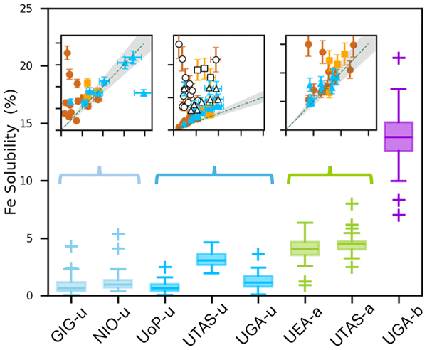 气溶胶微量元素的生物有效性主要取决于其可溶性。然而,采用不同方法测得的可溶性数据往往难以直接比较。为此,中国科学院广州地球化学研究所作为牵头单位,联合英国东英吉利大学、英国普利茅斯大学、美国佐治亚大学、澳大利亚塔斯马尼亚大学、印度国家海洋研究所,首次对八种常用的气溶胶可溶性微量元素提取方法开展了国际比对。研究结果表明,对于所分析的七种微量元素,相比于醋酸缓冲溶液,使用超纯水作提取剂测得的可溶性偏低。不同实验室超纯水提取结果之间的差异主要源于具体操作细节的不同,而与采用浸润式还是流动式提取方式无显著关联。该研究还发现,在提取地壳元素(铝、铁、锰)时,醋酸缓冲溶液提取法所获得的可溶性组分显著低于Berger提取法。该研究指出,虽然气溶胶来源与传输过程也会影响最终测得的微量元素可溶性,但通过制定涵盖分析方案、数据处理与数据验证的“最佳实践”指南,将有助于增强气溶胶微量元素可溶性数据的可比性。