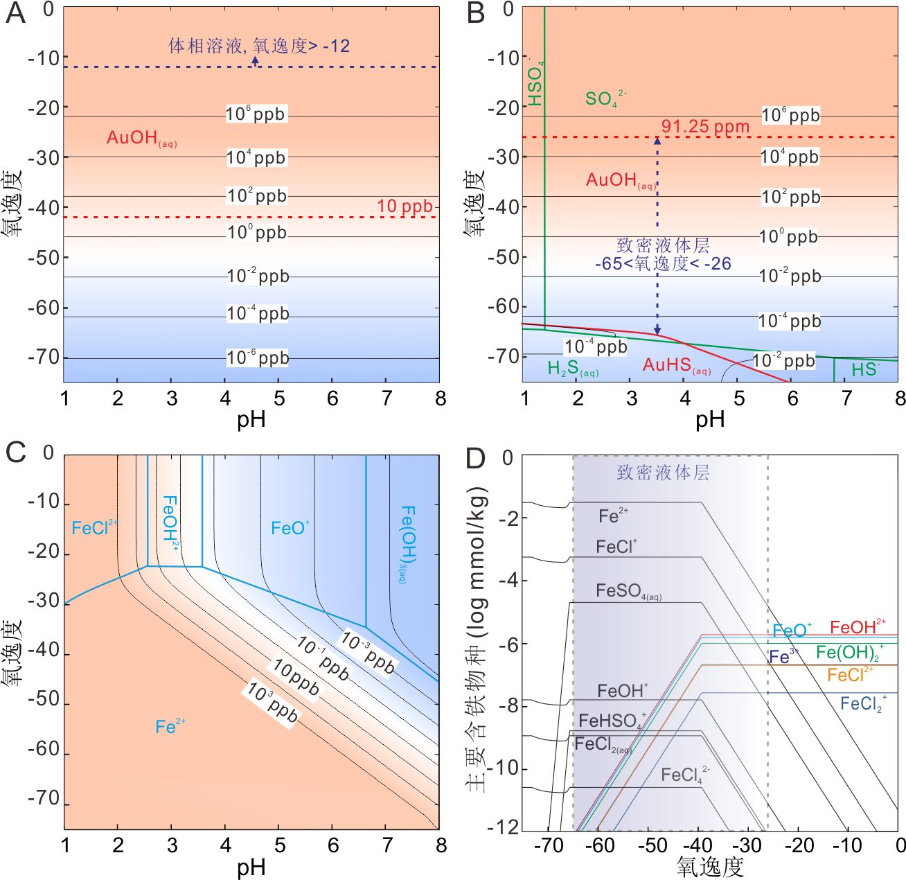 图2. (A)体相溶液与(B)致密液体层中金的溶解度相图;(C)致密液体层中铁的溶解度相图;(D)致密液体层中的主要含铁物种。