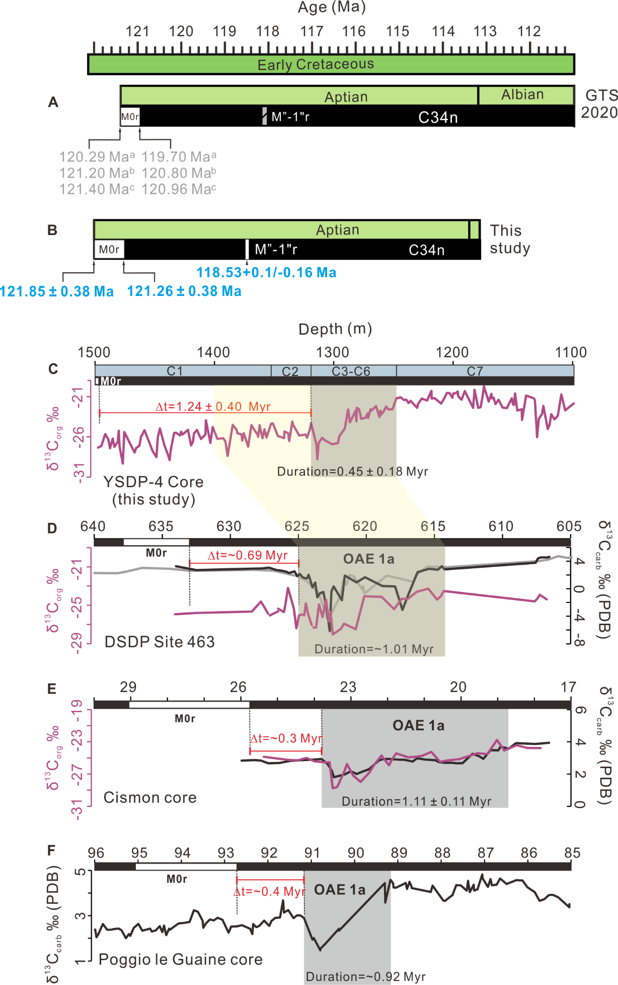(2) 基于频率磁化率(cfd%)参数开展了功率谱分析、滤波及405 kyr天文周期调谐,建立了新的高精度年龄-深度剖面。首次在陆相沉积地层中精确限定M0r的顶界年龄为121.26±0.38 Ma,结合前人约束的M0r持续时间0.59 Myr,推算M0r的底界年龄为121.85±0.38 Ma。精确约束M”-1”r (ISEA) 的年龄为118.53+0.1/-0.16 Ma。此外,结合碳同位素地层学,约束了陆相C3-C6段碳同位素异常的时限为120.02±0.13 Ma至119.57±0.12 Ma,持续时间为0.45±0.18 Myr,比海相地层记录的OAE1a持续时间(1.11±0.11 Myr)短0.66±0.21 Myr。