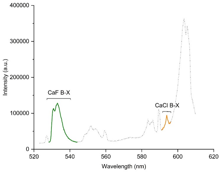 F和Cl的最强的发射光谱位于紫外 (UV) 光谱范围 (<200 nm),而其在可见光及近红外波长区域 (F:685.6 nm,Cl:837.6 nm) 的发射光谱强度极低,这一问题极大限制了低含量F和Cl的精准检测。为了解决该技术瓶颈,研究团队创新性地采用CaF和CaCl分子发射来替代F和Cl的原子发射,通过建立定标曲线,实现了对磷灰石中F和Cl的高效定量分析(图1)。