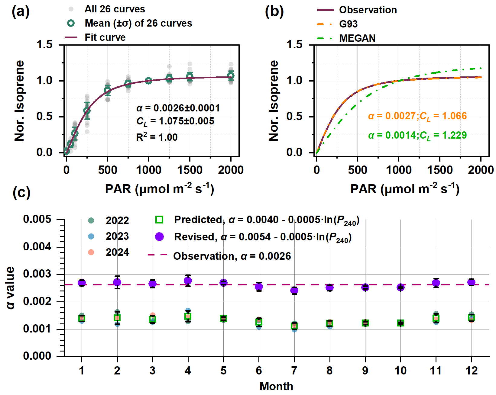 为厘清这一问题,中国科学院广州地球化学研究所王新明研究组曾建强博士后,利用统一的方法手段,选取华南地区典型热带树种健康的向阳叶片,在不同温度条件、不同树木个体、不同季节月份、不同树种、不同地点开展了原位光照梯度控制实验。实验结果显示了令人惊讶内在一致性:尽管测量条件多种多样,但所有热带树木向阳叶片排放异戊二烯对光的响应模式高度一致(图1)。当把所有测量数据综合起来分析时,得到一个比较一致的α值 (0.0026±0.0001)(图2a),这个数值大约是当前国际通用模型MEGAN所采用数值的近两倍。这意味着,实际树木排放这种气体对光照的响应,比现有模型假设的要敏感得多。研究团队提出了两种具体的模型改进方案:一是采用固定的新数值(α=0.0026)替代原有参数;二是将MEGAN模型中α公式的常数项由0.004增加到0.0053(图2c)。这两种方案都能更准确地模拟区域尺度上异戊二烯排放的日变化特征,特别是改善对早晨和傍晚时段的模拟效果。