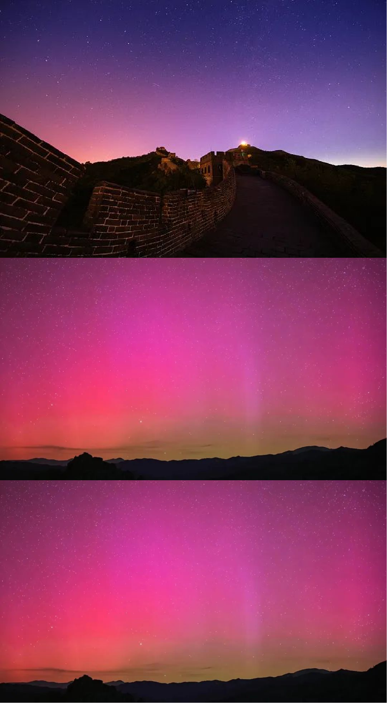 图1. 2024年5月12日,北京八达岭长城(上图)和新疆阿勒泰地区(下图)的极光景象(照片来源:视觉中国)